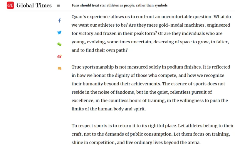 《环球时报》就此刊发文章《粉丝应将明星运动员视为 “人”,而非 “符号”》,文中提到: