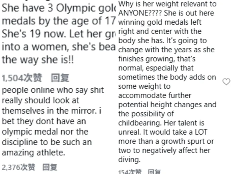 “她的体重跟任何人有什么关系???她用自己当下的身体状态赢下一块又一块金牌。随着年龄增长、身体发育,她的体型发生变化是很正常的,尤其是身体有时会为了适应身高增长、甚至未来生育的可能而增加一些体重。她有如此高的天赋,要想真正对她的跳水表现产生负面影响,可能需要经历一两次明显的生长发育期才会出现。”